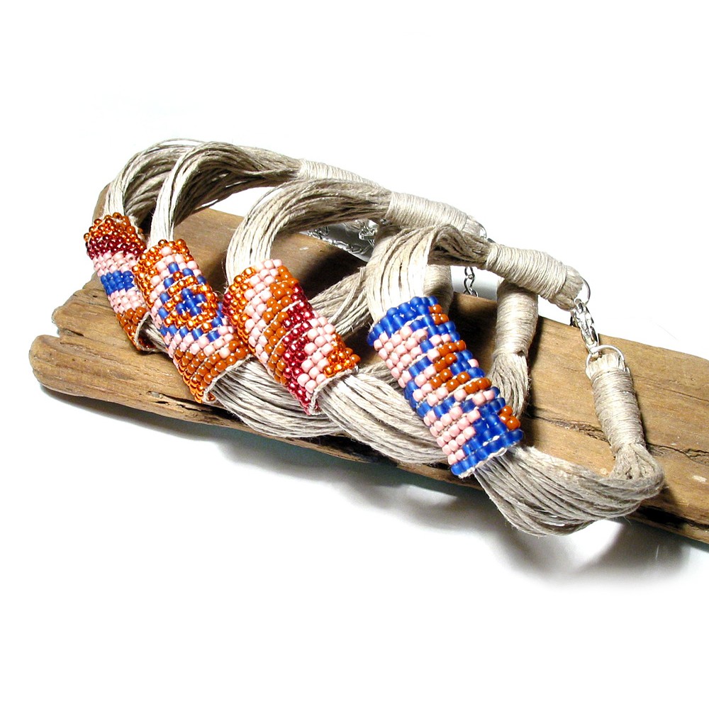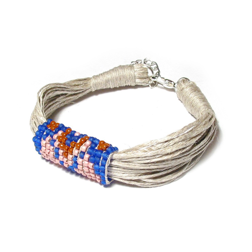 Bransoletka wykonana na splocie naturalnej przędzy lnianej z ozdobą wyplecioną z drobnych szklanych koralików japońskich toho. Subtelna i elegancka, dla pań ceniących naturę i swobodę. Wpisuje się w trendy stylizacji naturalistyczny, boho.