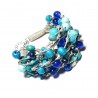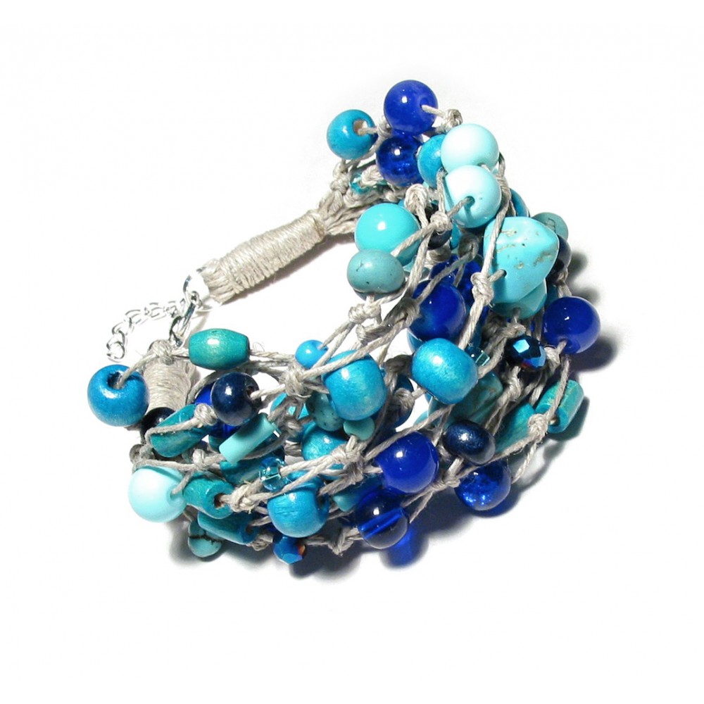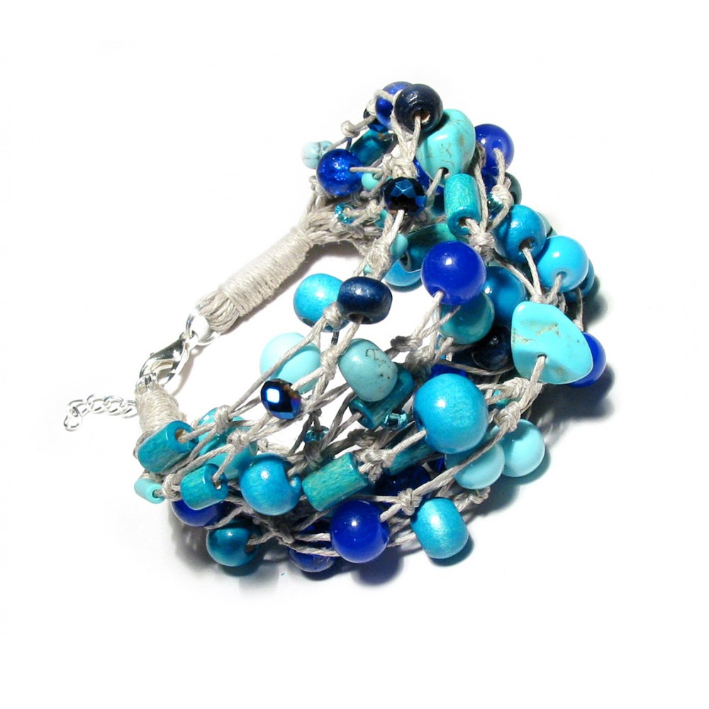 Autorska bransoleta utrzymana w tonacji błekitow i ultramaryn. W splocie znajdują się elementy szklane, drewniane, kryształy, bryłki turkusa i howlitu.