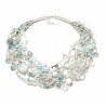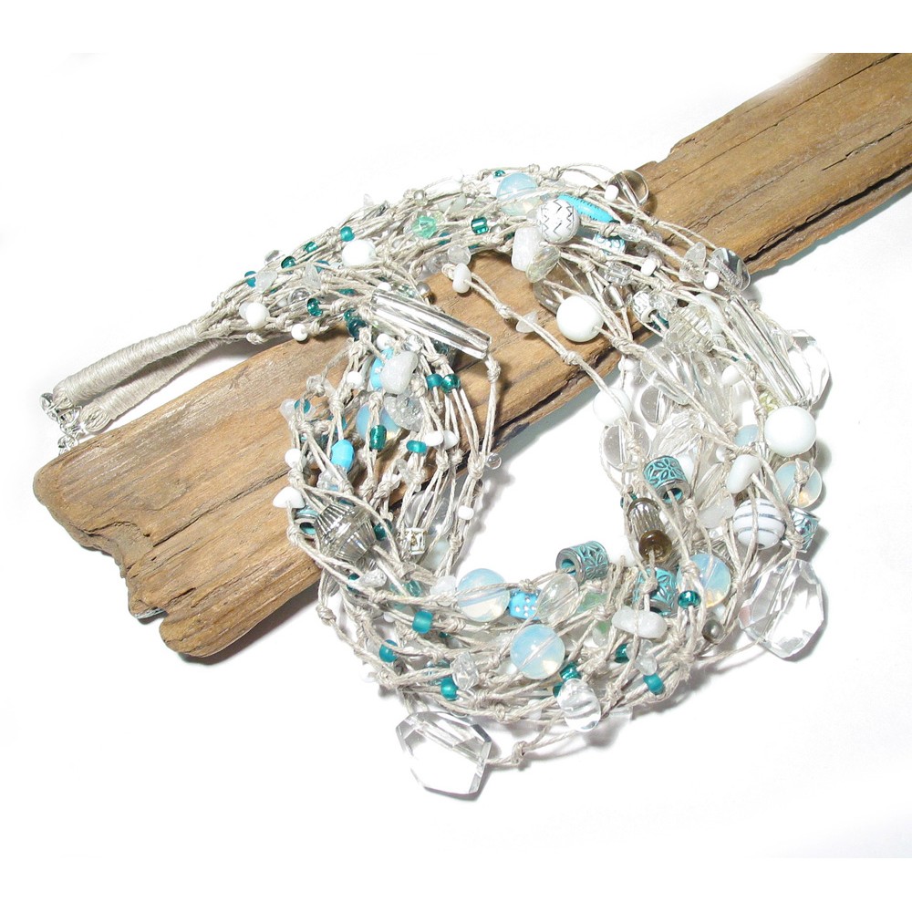 Autorski naszyjnik wykonany na naturalnej przędzy lnianej z elementów w tonacji bieli, lazurowych błękitów i transparentnego szkła. W splocie znajdują się bryłki kryształu górskiego, lodowego kwarcu, szkło, akryl i biały howlit. Długość naszyjnika mierzona po zapięciu ok.46 cm, zapięcie posrebrzany karabińczyk, dodatkowa regulacja długości.