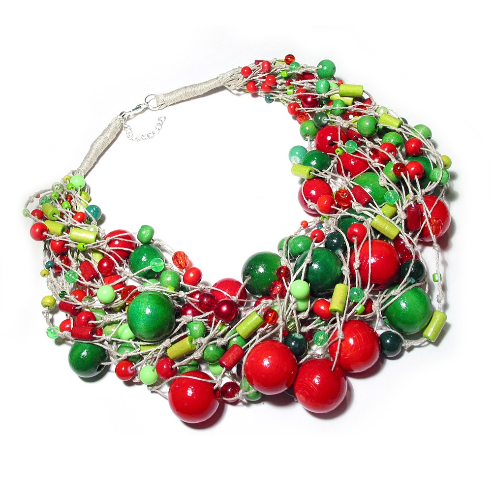 Bogaty lniany naszyjnik wykonany na kilkudziesięciu sznureczkach naturalnej przędzy lnianej. Całość utrzymana w soczystej kolorystyce czerwieni i świezych zieleni. W splocie znalazły się; korale szklane,akryl, szklane perełki, drewno. Długość naszyjnika mierzona po zapięciu ok. 50cm. Zapięcie posrebrzane, dodatkowa regulacja długości..
