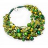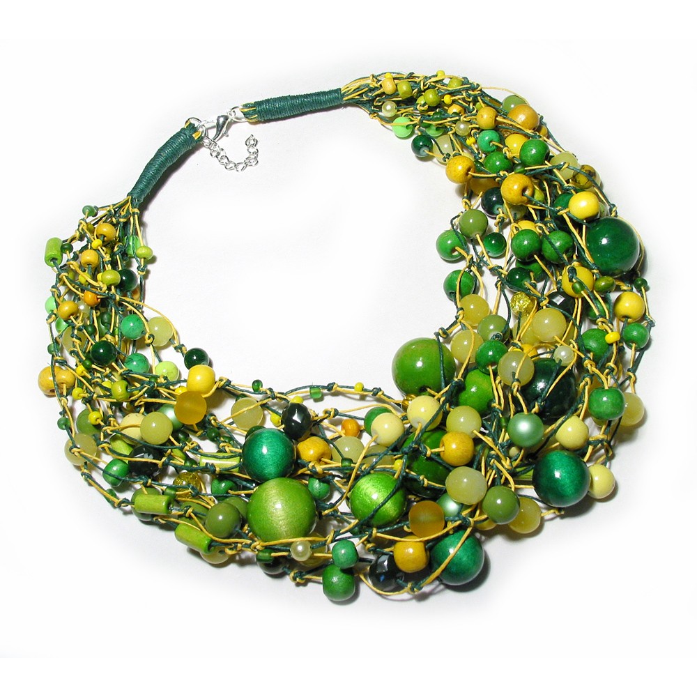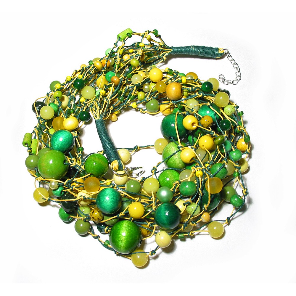 Lniany naszyjnik wykonany w kolorze soczystej zieleni i słonecznej żółci. Powstał na splocie żółtej i zielonej przędzy lnianej. W splocie znajdują się: drewno, szkło Jablonex.