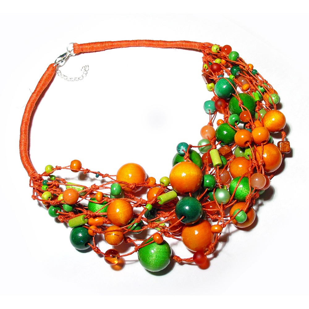 Soczyste połączenie nasyconego oranżu i świeżych zieleni. Powstał na oranżowej przędzy lnianej z elementów drewnianych, szklanych , karneolu oraz szklanych perełek. Długość naszyjnika mierzona po zapięciu ok. 50 cm, dodatkowa regulacja długości, zapięcie posrebrzane.